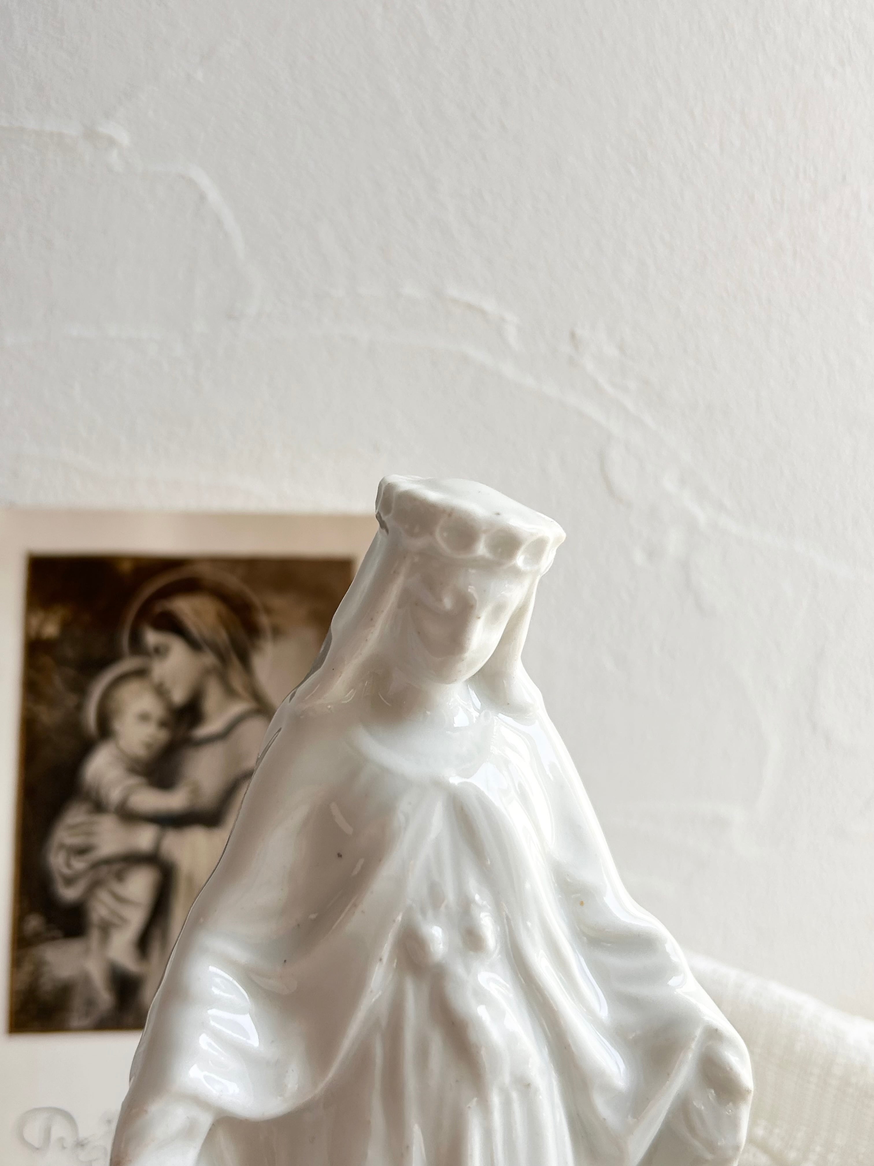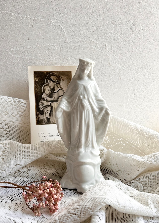 from France 1800年代後期頃 H 15.5㎝×W 6.5㎝×D 5㎝程 清らかなオーラの白磁のマリア像。 冠を被り、手を広げ、蛇を踏んでいます。 お顔はとても優しいです。 穢れなき平和の女神様 どうか どうか 世界が平和でありますように。 ※一緒に撮影しているお品は別売りとなっております。 長い年月を経たお品ですので、傷や変色、傷み、ダメージなどもございます。 古きものならではの味わいとしてお楽しみいただけましたら幸いです。 できるだけ、実際の商品に近いイメージをお伝えできますようにお写真をご用意しておりますが、 ブラウザによって多少異なることがございます。 ゆっくりとお写真をご確認の上、ご検討くださいませ。