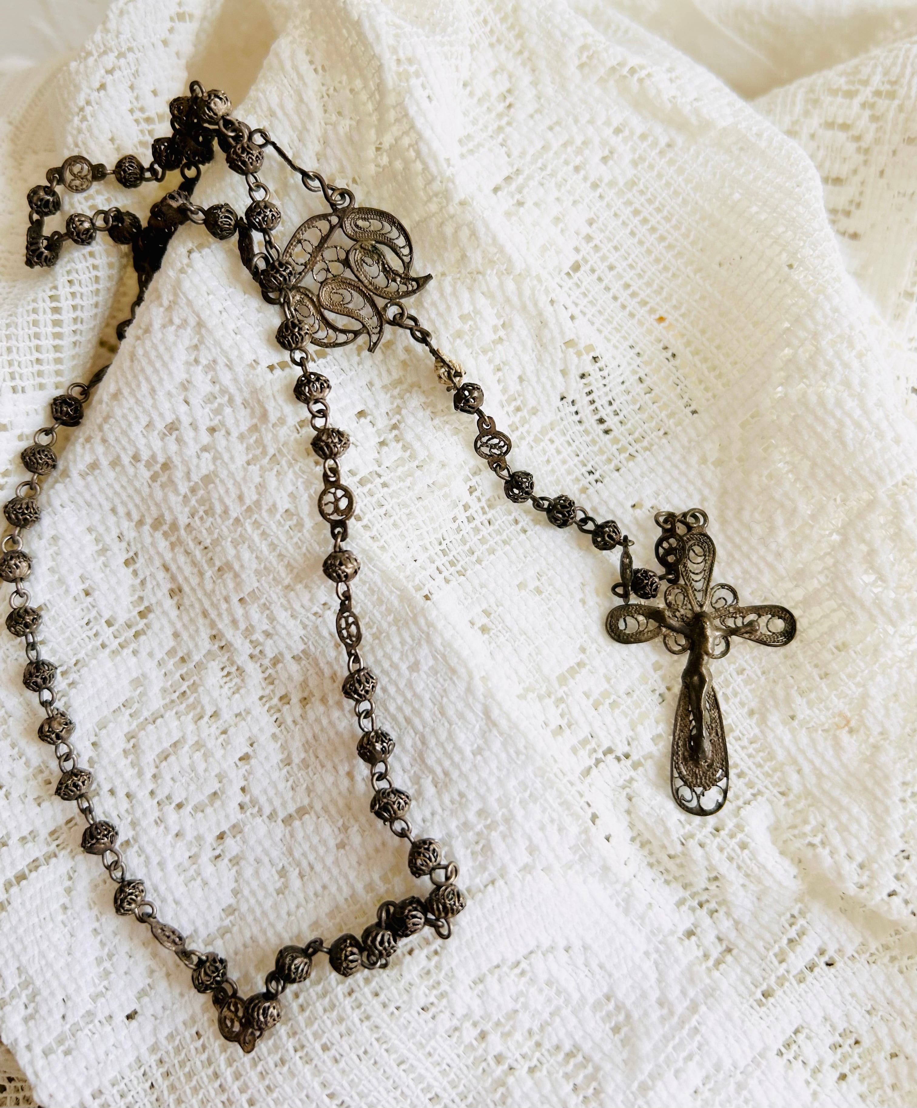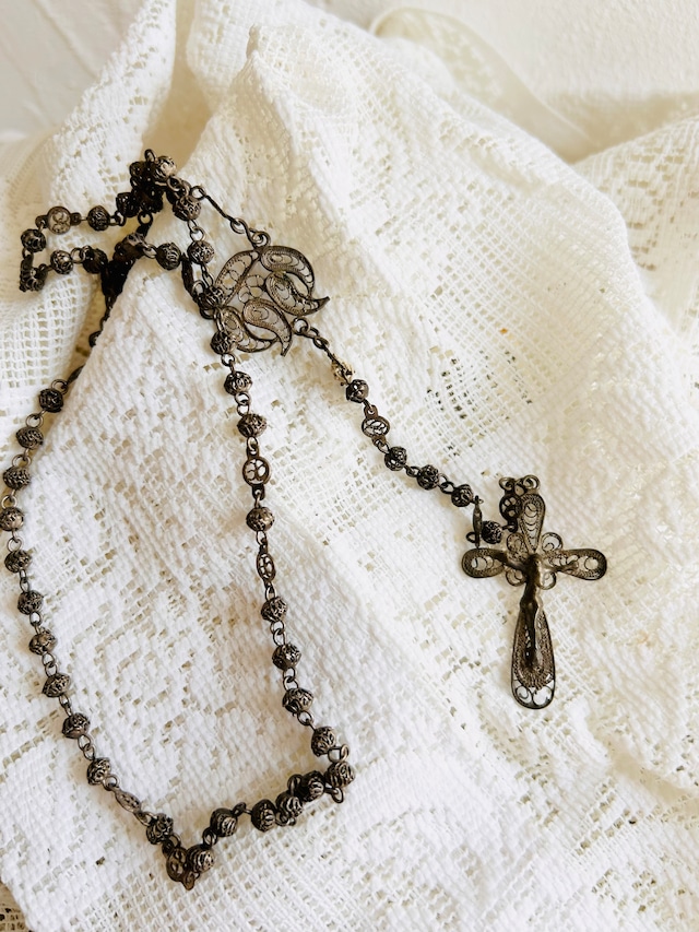 from France 1900年代中期頃 全長 36㎝ 首周り 48㎝ クロス 3.5㎝程 銀線細工を模して作られたロザリオ。 1箇所破損部分があり 糸で繋いで修理されています。 首にはかけることができませんが、 祈祷書と一緒に置いていたり お祈りの時に手に持ったり 壁にディスプレイしたり 日常に溶け込み 優しい時間に寄り添ってくれるお品です。 ※一緒に撮影しているお品は別売りとなっております。 長い年月を経たお品ですので、傷や変色、傷み、ダメージなどもございます。 古きものならではの味わいとしてお楽しみいただけましたら幸いです。 できるだけ、実際の商品に近いイメージをお伝えできますようにお写真をご用意しておりますが、 ブラウザによって多少異なることがございます。 ゆっくりとお写真をご確認の上、ご検討くださいませ。