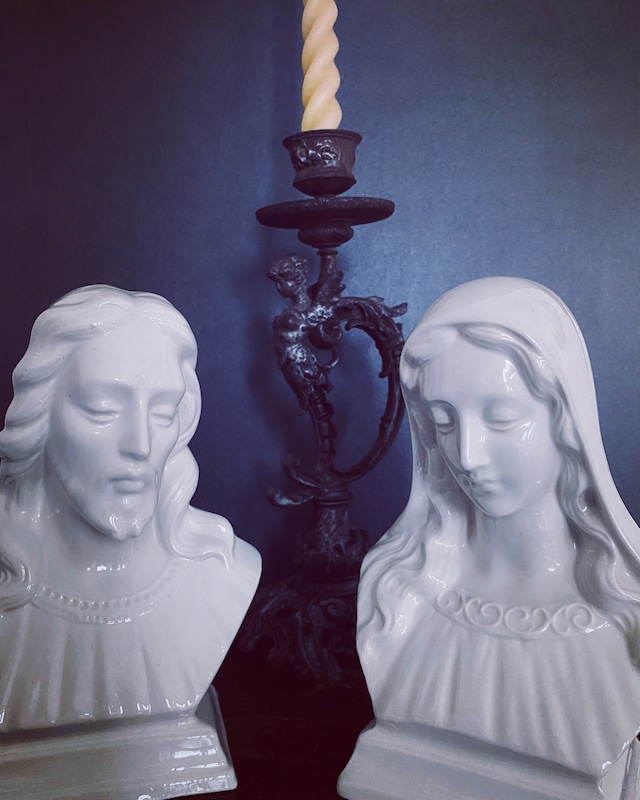 from USA マリア様 H 17.5㎝×W 12㎝×D 8.5㎝程 イエス様 H 17㎝×W 12㎝×D 8㎝程 1960年代 陶磁器製のマリア様とイエス様の胸像です。 底面にはHolland Moldと記されています。 傷や亀裂がなく、 奇跡のように美しいお姿でこの地に降り立ちました。 静けさと安らぎを感じるお二人。 柔らかな表情に癒されます。 ぜひともお二人セットでお迎え頂きたく思います。 長い年月を経たお品ですので、傷や変色、傷み、ダメージなどもございます。 古きものならではの味わいとしてお楽しみいただけましたら幸いです。 できるだけ、実際の商品に近いイメージをお伝えできますようにお写真をご用意しておりますが、 ブラウザによって多少異なることがございます。 ゆっくりとお写真をご確認の上、ご検討くださいませ。