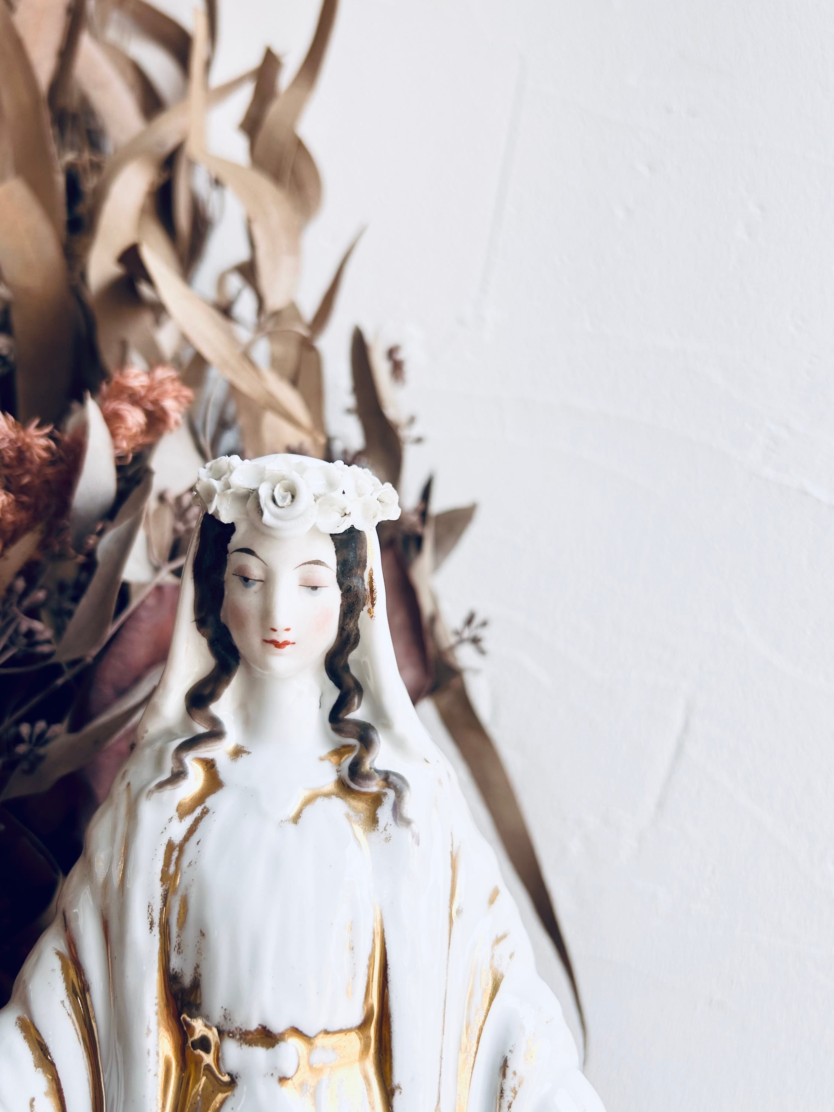 from Belgium 1900年代初頭頃 H 31㎝×W 13㎝×D 12㎝程 磁器製 ブルーアイとピンクの頬が可愛らしく 表情は凛とクールなマリア像。 繊細な花冠と髪のカールがとても好きです。 右手人差し指、左親指に欠けがございますが 長い年月を経て ここまで美しく立っていてくださったと思うと 嬉しく 愛おしさが込み上げます。 無原罪の聖母像が蛇を踏んでいるのは 真の平和をもたらすことを表現しています。 世界の平和を 心からお祈りいたします。 ※一緒に撮影しているお品は別売りとなっております。 長い年月を経たお品ですので、傷や変色、傷み、ダメージなどもございます。 古きものならではの味わいとしてお楽しみいただけましたら幸いです。 できるだけ、実際の商品に近いイメージをお伝えできますようにお写真をご用意しておりますが、 ブラウザによって多少異なることがございます。 ゆっくりとお写真をご確認の上、ご検討くださいませ。