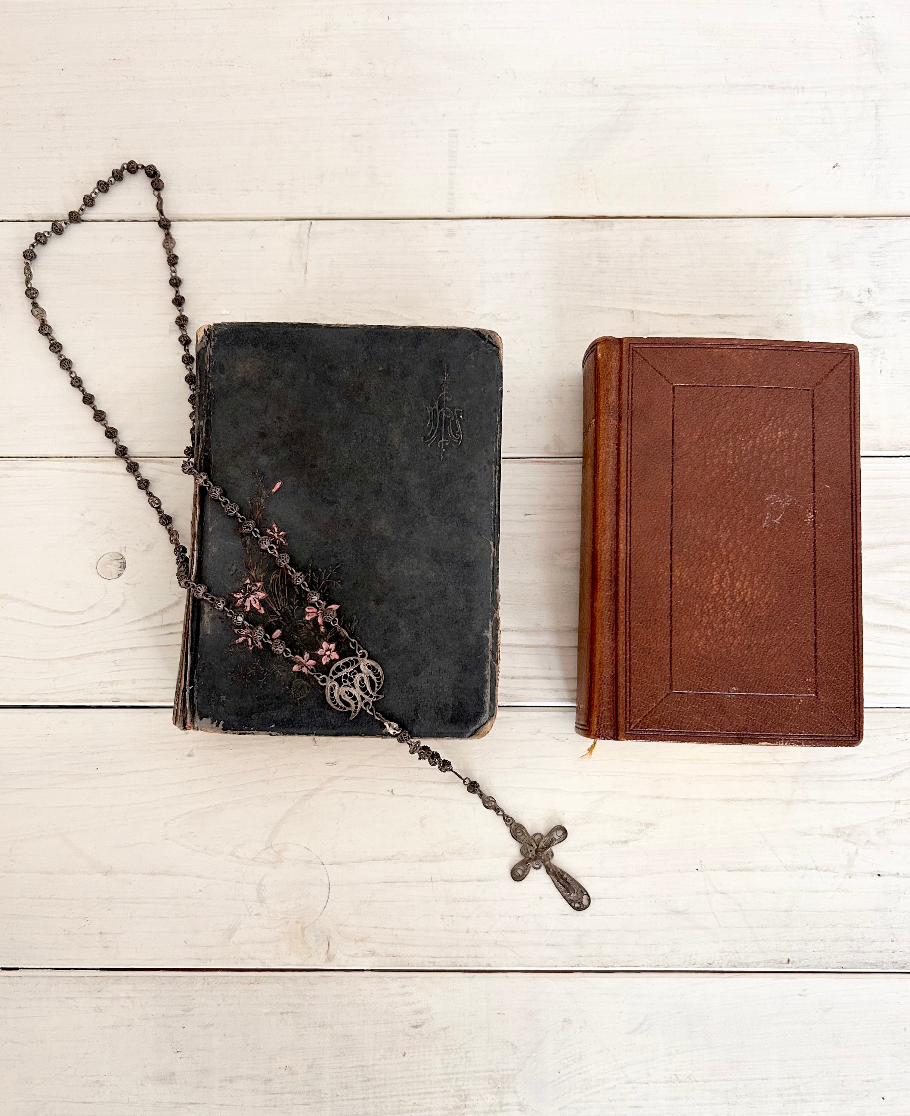from France H 13.5㎝×W 10㎝×D 3.5㎝程 514ページ (フランス語) 1920年12月1日と記された古い祈祷書です。 黒い革製のカバーに お花模様とクロスがエッチングされています。 痛みや破れがあり、 とても熱心に読まれていたことが伝わってきます。 所々のページには しおりを挟むようにホーリーカードや お花模様の紙などがはさまれております。 いつでも読みたい場所にマークをつけて。 愛しい気持ちになります。 ※一緒に撮影しているお品は別売りとなっております。 長い年月を経たお品ですので、傷や変色、傷み、ダメージなどもございます。 古きものならではの味わいとしてお楽しみいただけましたら幸いです。 できるだけ、実際の商品に近いイメージをお伝えできますようにお写真をご用意しておりますが、 ブラウザによって多少異なることがございます。 ゆっくりとお写真をご確認の上、ご検討くださいませ。