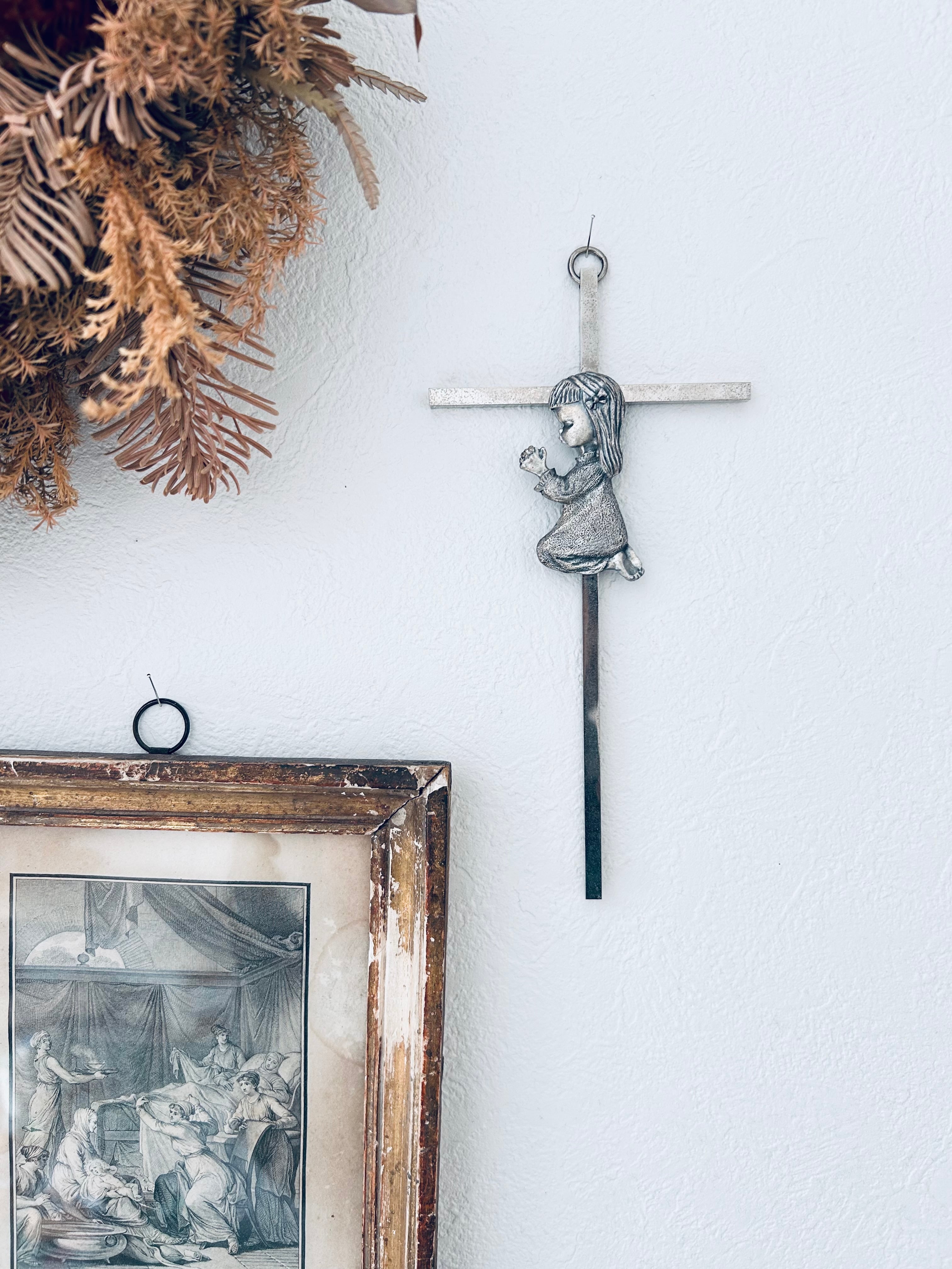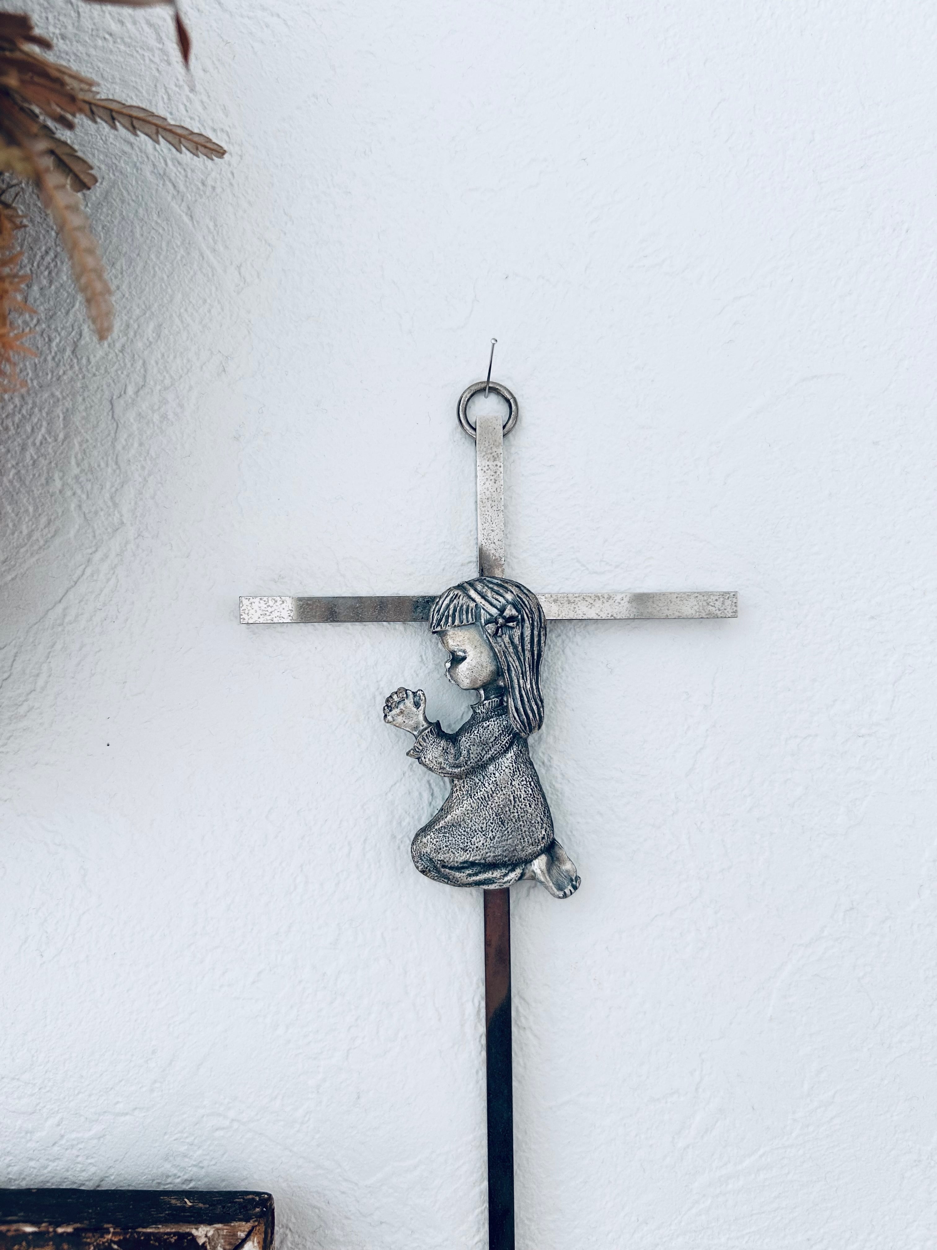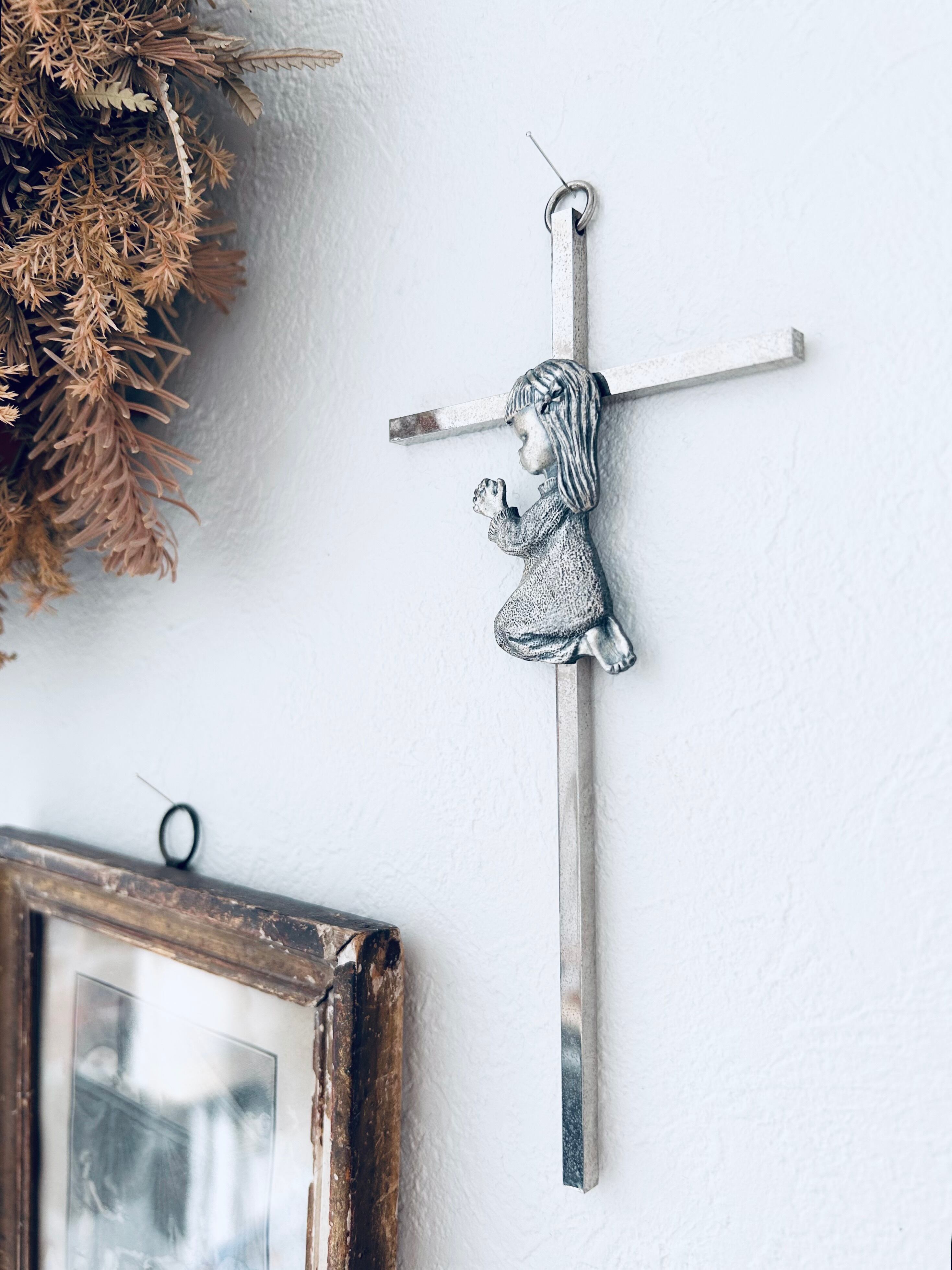 熱心に祈る少女が愛らしい金属製のクロス。