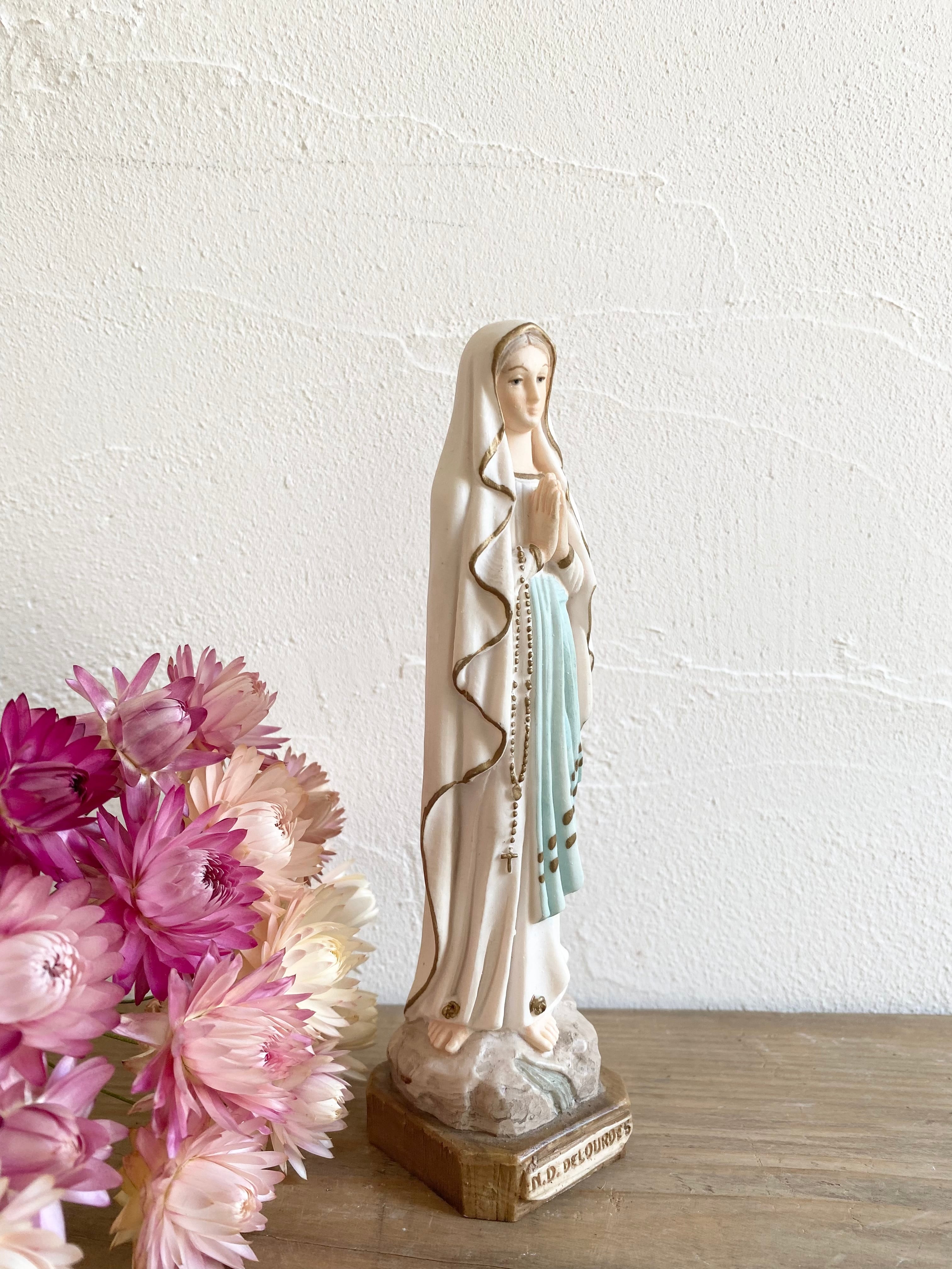 ロザリオを手に掛け祈るマリア様の足元にN.D DELOURDES(ルルドの聖母)